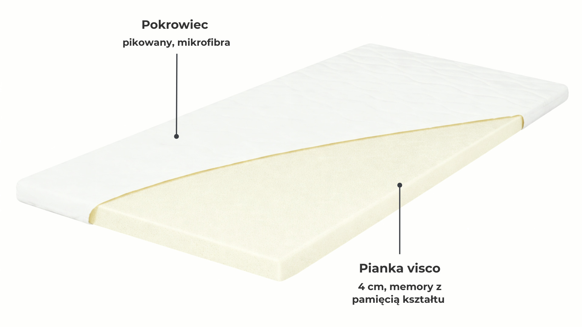 Nakładka wykonana z 4 cm pianki visco memory, która dopasowuje się do kształtu ciała, reagując na ciepło i nacisk.